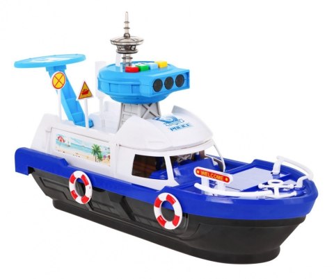 Policyjna łódź z akcesoriami wyposażona w funkcje dźwiękowe i świetlne to idealna zabawka dla wszystkich małych miłośników policji już od 3-go roku życia. Łódź posiada wieżyczkę kontrolną zasilaną bateriami typu 3 x AG13 (w zestawie), na której znajduje się panel dźwiękowo-świetlny z 4 alarmami policyjnymi i mrugającymi światełkami. Dach łodzi jest otwierany, w środku umiejscowiono pokład z doczepianą w tylnej części zjeżdżalnią dla resoraków dołączonych do zestawu. Pod pokładem oraz po bokach łodzi znajdują się także zjeżdżalnie.