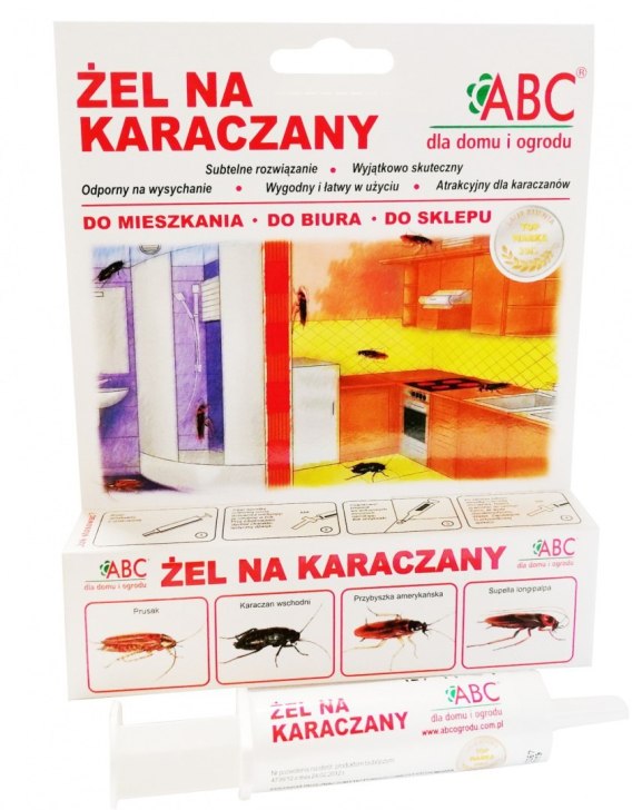 ABC żel na karaczany to nowy preparat służący do zwalczania larw i osobników dorosłych karaczanów-karaluchów i prusaków w domach i mieszkaniach. ABC żel na karaczany może być również stosowany w miejscach, gdzie wymaga się specjalnej ostrożności przy zabiegach dezynsekcyjnych np: szpitale, szkoły, restauracje, hotele, samoloty, biura, domy opieki, zakłady przetwórstwa spożywczego itp. oraz w miejscach, gdzie znajdują się urządzenia elektryczne, przełączniki czy komputery. Stosowanie ABC żel na karaczany jest bardzo proste i nie zaburza codziennych czynności domowników oraz pracowników kuchni, szpitali czy hoteli. ABC żel na karaczany należy stosować na oczyszczone i odtłuszczone powierzchnie. ABC żel nie należy stosować w miejscach, które są często zmywane i czyszczone.